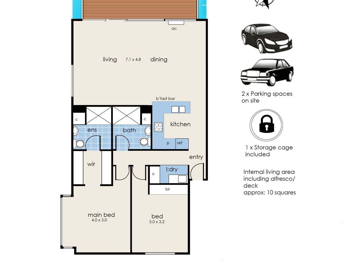 Step inside and discover an open, light-filled layout designed for relaxed modern living, featuring a sleek stone-topped kitchen with quality Euro stainless steel appliances, generous living and dining zones that flow seamlessly to the huge outdoor balcony, and two well-proportioned bedrooms – the master with a private ensuite and walk-in robe.